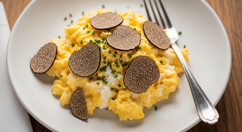 Pour un rendu élégant, servez votre brouillade dans des assiettes creuses et utilisez des couverts en argent ou en inox poli pour éviter d’altérer le goût. La finition avec des lamelles de truffe expose la beauté et la sophistication de ce plat. N’oubliez pas, la première impression est souvent celle qui reste!